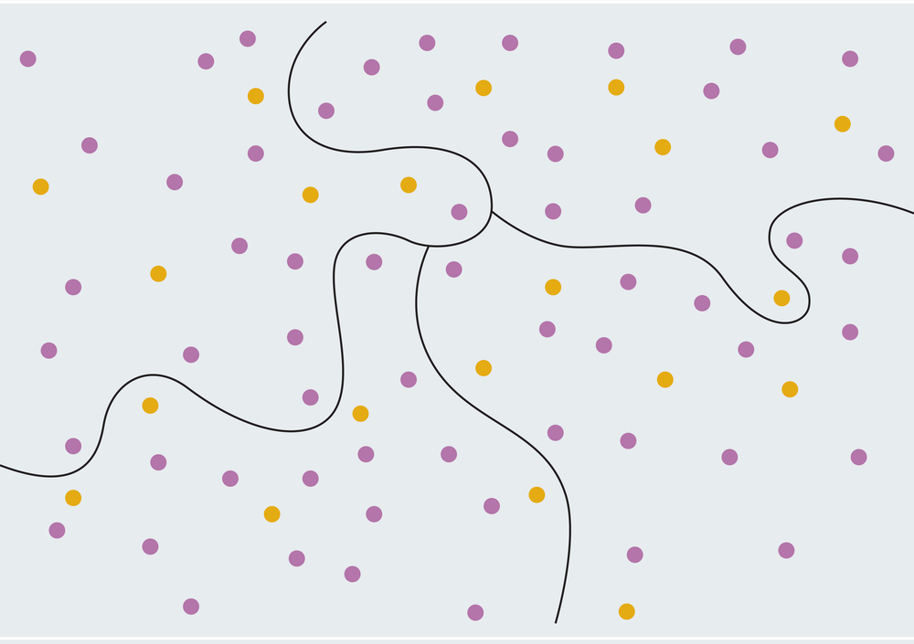 Let’s revisit our example: a total of 80 voters consisting of 60 Purple Party supporters and 20 Yellow Party supporters. The ham sandwich theorem tells us that no matter how they’re distributed, we can draw a straight line with exactly half of the Purple voters and half of the Yellow voters on either side (30 Purple and 10 Yellow on both sides). Now treat the two areas you’ve created as new ham sandwiches, splitting each in half with its own straight line so that every resulting region contains 15 Purples and five Yellows. Purple now has the same gerrymandered advantage as before (it wins every district), but the resulting regions are all simple shapes with straight-line boundaries!