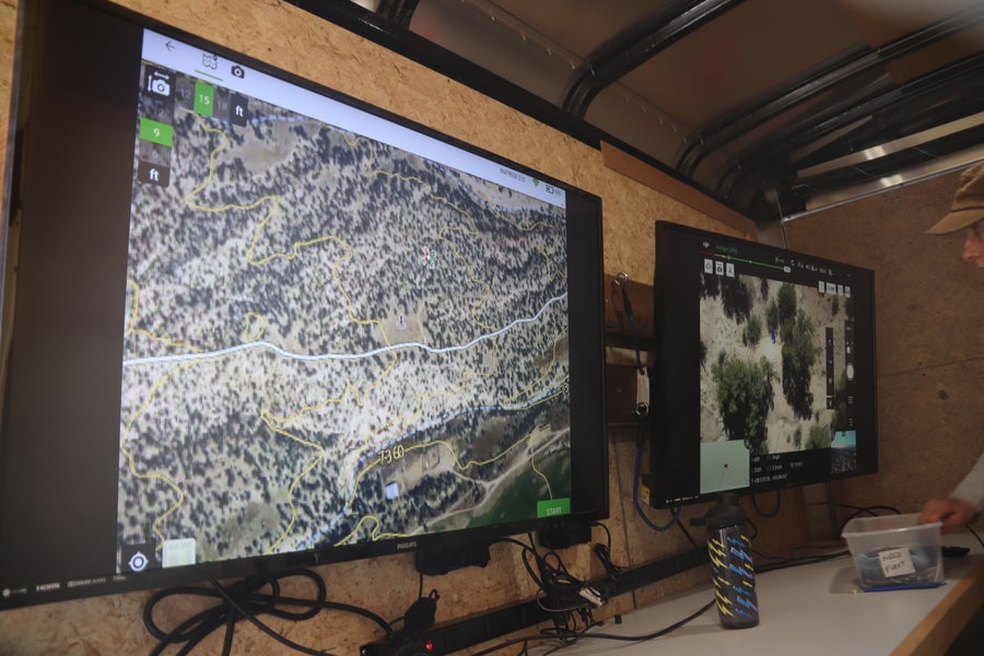 Inside a trailer that serves at the drone control center for Chaffee Search and Rescue South. The map on the left monitor shows the drone's location and takeoff point, while the other monitor (right) displays the pilot's view, including a live video feed from the drone.