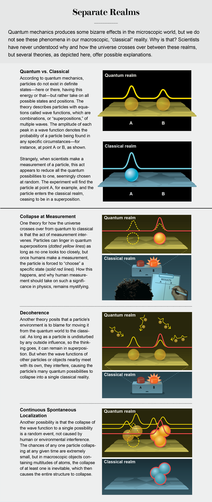 But what if one of these experiments does pan out and confirms the phenomenon of quantum collapse? Would that mean an end to the mysteries and paradoxes of the theory? “If collapse really existed, it would divide the world into different scales,” says Igor Pikovski, a theoretical physicist at the Stevens Institute of Technology in Hoboken, N.J. “Above a certain scale quantum mechanics would cease to be the correct theory. But below that scale everything we know about quantum mechanics would still hold. So the same philosophical questions and interpretations that bug us would still hold for the lower scale. You’d still have many worlds for electrons or atoms—but not for the moon! So it doesn’t solve some of the problems—I think it makes it more strange.”