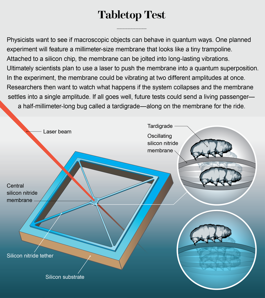 And Gröblacher and his colleagues do not plan to stop there. The researchers hope to ultimately place a living creature on the membrane and then put the membrane, and any passengers on it, into a quantum superposition. Leading candidates for that mission into quantum space are eight-legged microorganisms called tardigrades, also known as water bears. “They’re amazing creatures,” Gröblacher says. “You can cool them down—they’re still alive; you can heat them up—they’re still alive; put them in a vacuum—they’re still alive.” He admits this step is a bit of a ways off. “It’s not crazy. It’s nice as a long-term goal, but first we have to get our devices into superposition; then we can think about putting in a living organism.”