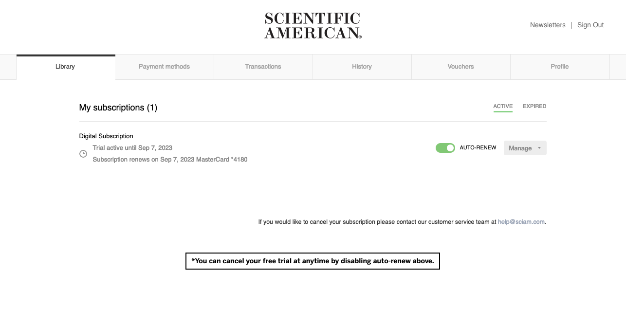 Customers can cancel free trial subscriptions at any time by signing into their account and disabling the auto-renew button in My Account/Library.